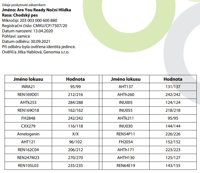 | Ostatní vyšetření: | DM: G/G, Lokus D: D/d, RYR1: T/T, Genetický profil: ano, Spondylóza: neg., LTV: 1, OCD: neg., | ||||