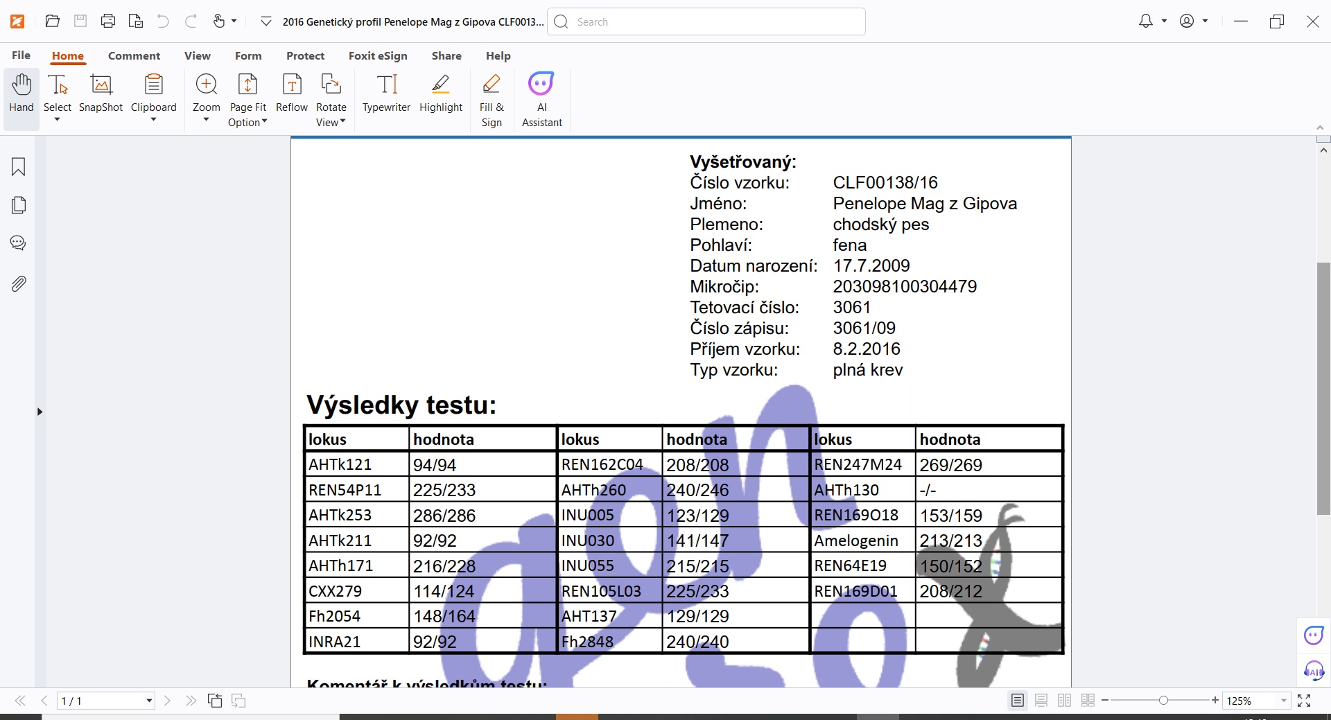 | Ostatní vyšetření: | Genetický profil: ano, | ||||